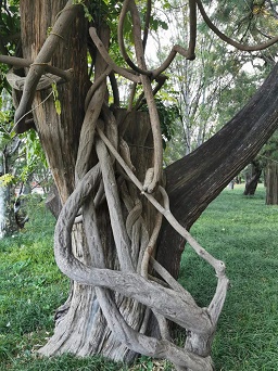 我们从破洞处进入了陶然亭公园,走进公园以后,首先映入我们眼帘的是各种千姿百态的古木奇树,令人目不暇接。特别是有些枯树,树干上已经没有了枝叶,但是树根还是牢牢地扎到地里,渐渐变粗,支撑着枯树不倒,有着枯木宁死不屈的奇特感觉。枯树上还缠绕着藤子,藤子长得枝叶茂盛,越长越粗,越长越宽。我想可能是藤子的附着把树绞死了,形成了自然界独特的植物绞杀现象。风有时能带动藤子飘动,好像给枯树增加一些活力,在迎风起舞,猛的一看像一个魔鬼要抓什么似的,看了让人不寒而栗。此外,走在公园内的土路上,也可以看到纵横交错如蛟龙盘绕的地面根,上面附生着地衣、苔藓。