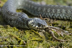 我们不敢再往里走去,看到湖边有几个人在钓鱼,还有几个人在围观着什么,好奇心促使我们走了过去。走过去我们看到了一条一尺多长的水蛇正在吞噬一只青蛙,水蛇是褐色的,瘦小的像一根绳子,不过它嘴里正在吞噬一只大青蛙。水蛇竭尽全力在向里吞,青蛙已经被水蛇吞了一半,但是青蛙两只后腿在用力的向后蹬,力图摆脱水蛇的吞噬。